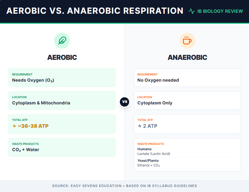 Aerobic vs anaerobic respiration IB is a common exam distinction. Aerobic respiration requires oxygen, occurs in the mitochondria, and produces a large yield of ATP (~36-38). Anaerobic respiration occurs in the absence of oxygen within the cytoplasm. In humans, it produces lactate; in yeast, it produces ethanol and CO2. Both produce a very small yield of ATP (2 ATP from glycolysis).